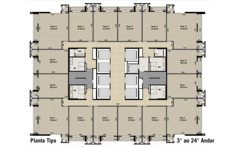 * 16 conjuntos por andar, totalizando 352 conjuntos, de 37,50 m², 38,70 m² e 57,64 m², meia laje, ou laje corporativa de 685,36 m²;
