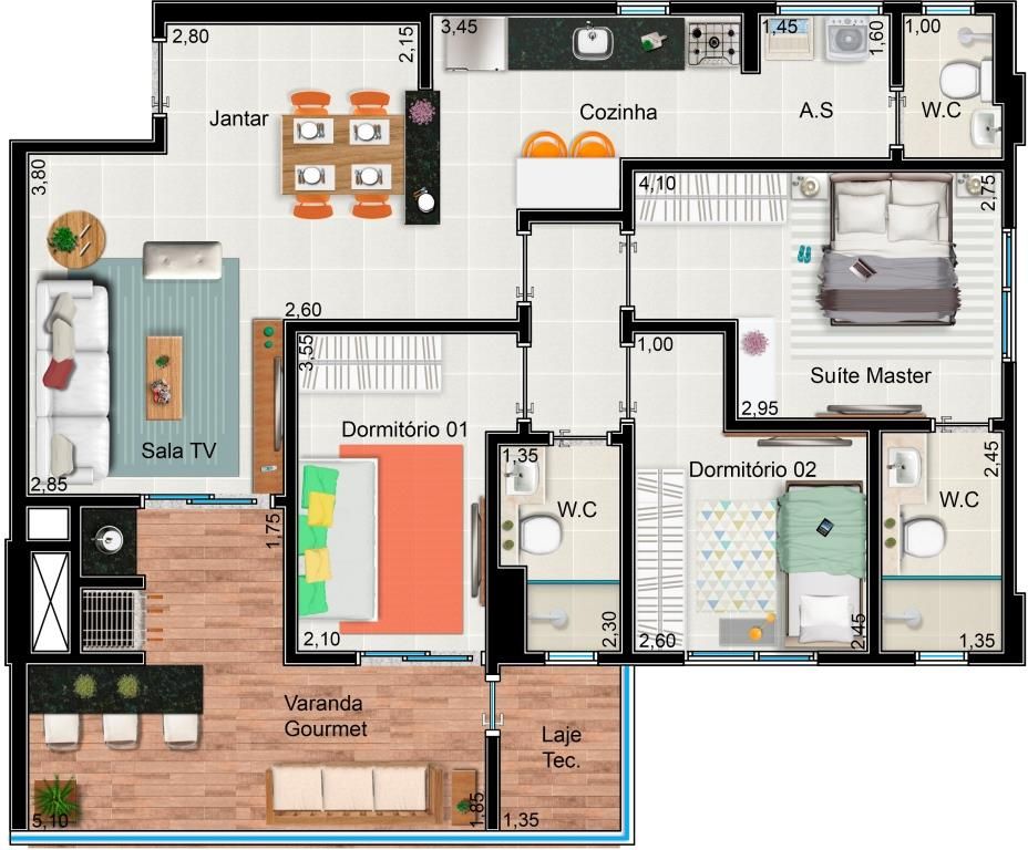 Apartamento de 93m², 3 dormitórios, sendo 1 suíte e banheiro social, living, box com vidro blindex, espelhos, ampla varanda gourmet, despensa, armários planejados, sacada com fechamento em vidro blindex, 2 vagas cobertas. Lazer com piscina aquecida, churrasqueira, salão de festas e academia, Tubulação para ar condicionados Split em todos os ambientes. Os chuveiros e lavatórios do banheiro social, da suíte e a pia da cozinha serão com aquecimento a gás com medidor individual para cada apartamento.