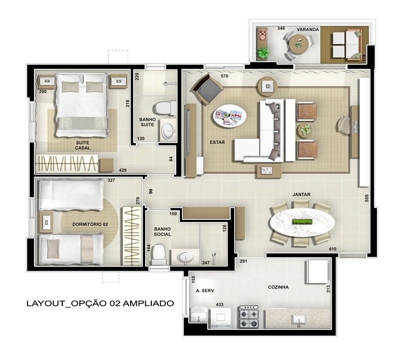 •Quartos: 2 dormitórios planejados, sendo 1 suíte com possibilidade do 3ª dormitórios.